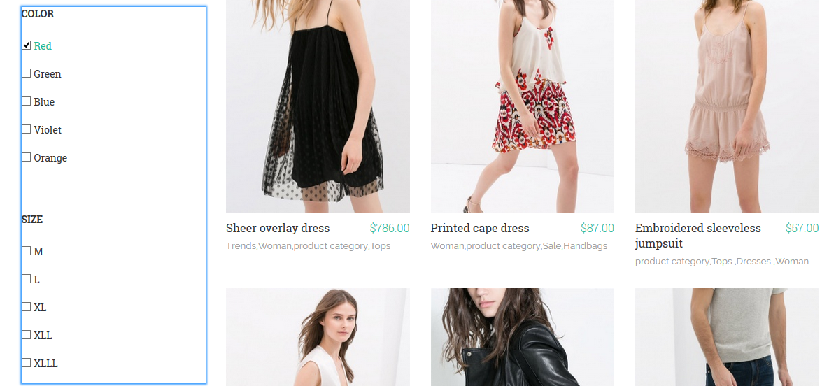 - Filters: Filter_by_color, Filter_by_size (filters can be created in Hikashop Dask Board >> Display >> Filter )