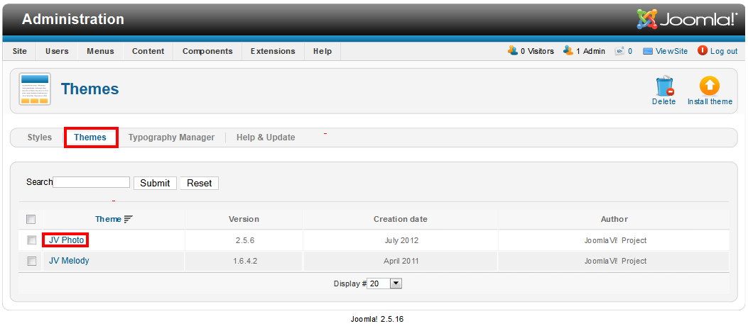 ✔ Step 3: Once you have JV Framework installed, you need to install theme: Go to Component -> JV Framework -> Tab Themes-> Click Install theme -> Browse JV Photo Theme Zip file to install